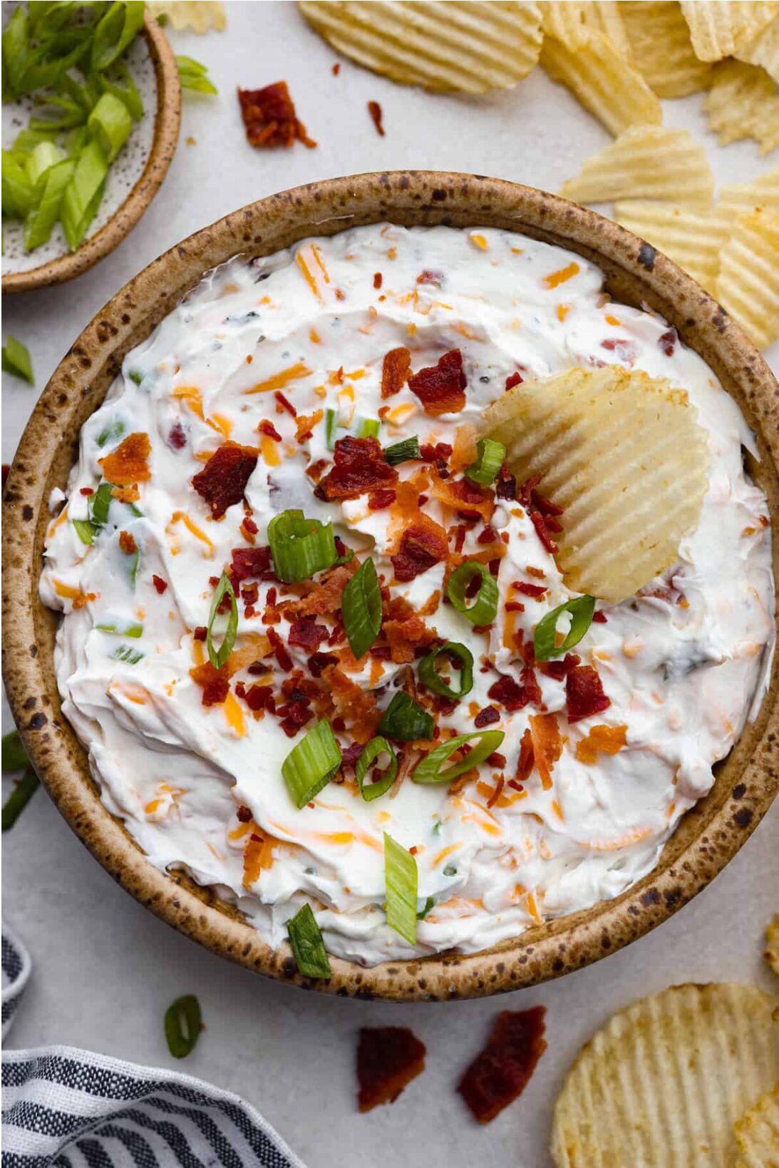 Before serving, sprinkle some green onions, cheese and bacon bits on top for decoration. Serve with vegetable strips, potato chips or salty crackers for a better flavor.